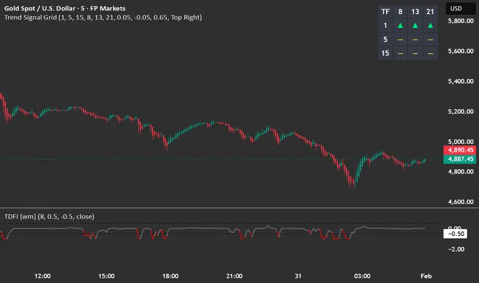 Based on Trend Direction & Force Index - TDFI [wm] by Causecelebre, the TDFI Grid is a multi-timeframe momentum indicator that builds on the original TDFI concept. It calculates TDFI across three user-selectable timeframes using three different lookback periods, creating a 3×3 consensus grid (9 readings total).