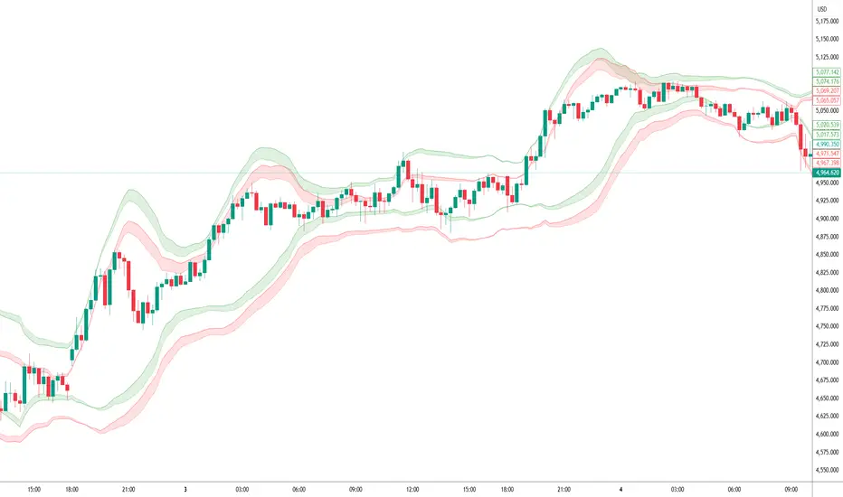 Four independent, customizable Bollinger Band sets (different lengths, MA types, multipliers, sources, colors)