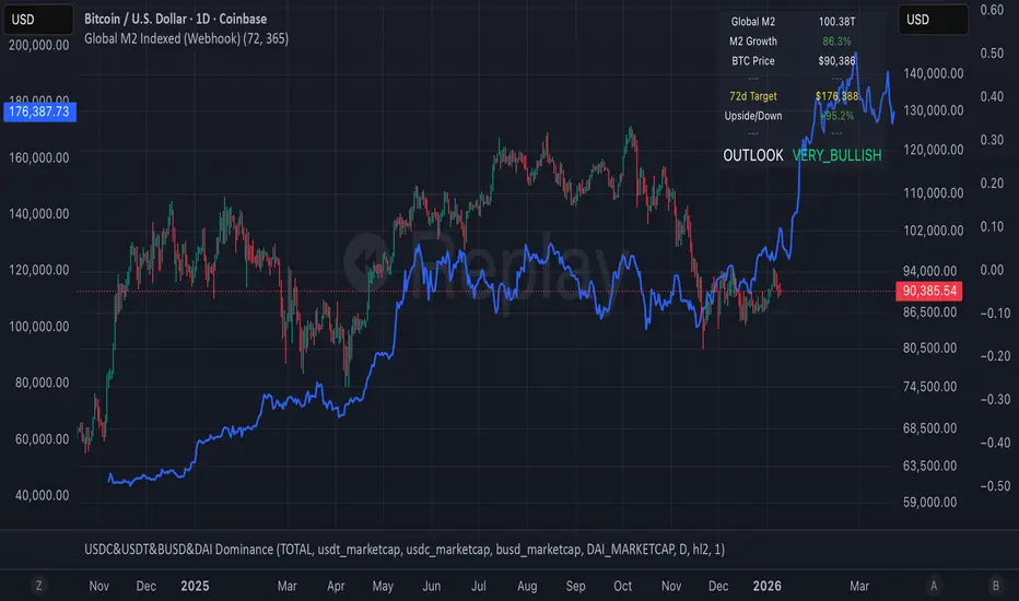 Global M2 money supply indicator that tracks liquidity from major economies (US, China, Japan, UK, Eurozone) and correlates it with Bitcoin price movements.