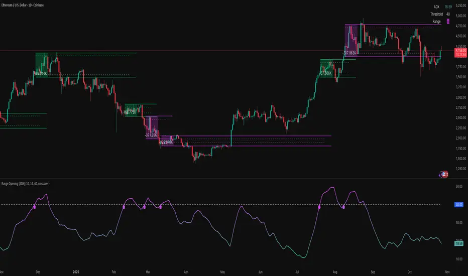 The range begins when ADX crosses a custom threshold, indicating a shift in trend strength: