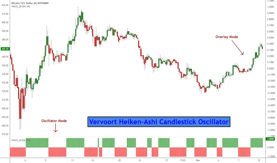 Heiken-Ashi Candlestick Oscillator (HACO), by Sylvian Vervoort, is a digital oscillator version of the colored candlesticks.