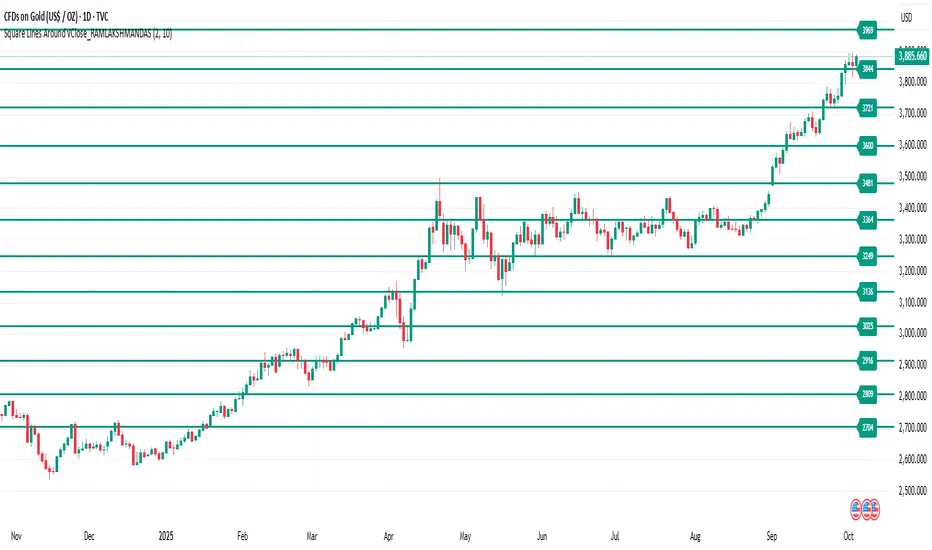 This indicator draws horizontal lines at square-number price levels around the square root of the current closing price. Inspired by Gann’s geometric approach, these lines serve as potential support and resistance levels. Each line is labeled with its price for easy identification. Traders can use it to visualize mathematically significant zones, identify reversal points, and enhance numerical trading strategies.