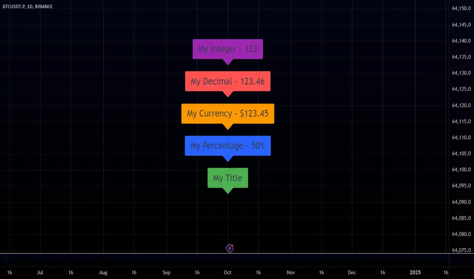 This script is a tinny library for creating and displaying formatted values in TradingView scripts. It provides a structured way to present key information like titles, percentages, currency values, decimals, and integers with clear formatting. This allows you to coordinate your strings in advance and hold one item to use for calling your string to a label, box, table.. Made for day to day use of most typical use cases, more advanced techniques should be used for complicated scenarios.