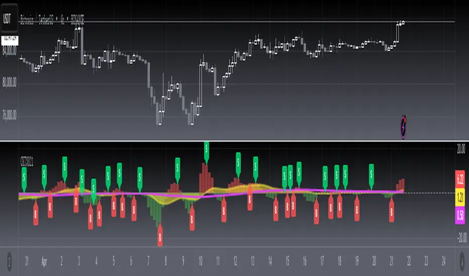* Displays "B" (buy) and "S" (sell) labels at signal points.