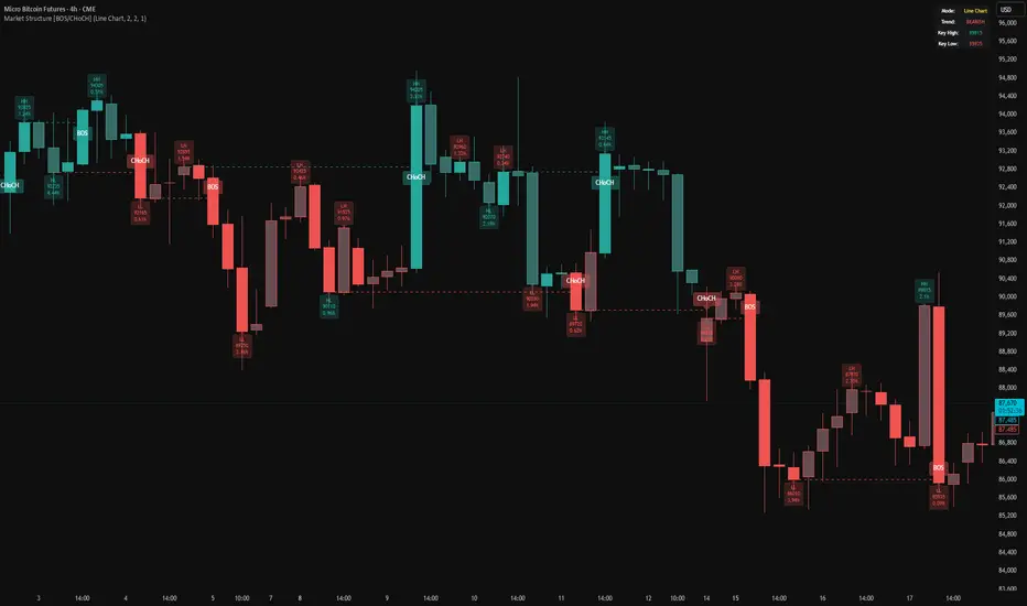 A comprehensive market structure indicator that identifies Break of Structure (BOS) and Change of Character (CHoCH) patterns - essential concepts in Smart Money trading methodology.
