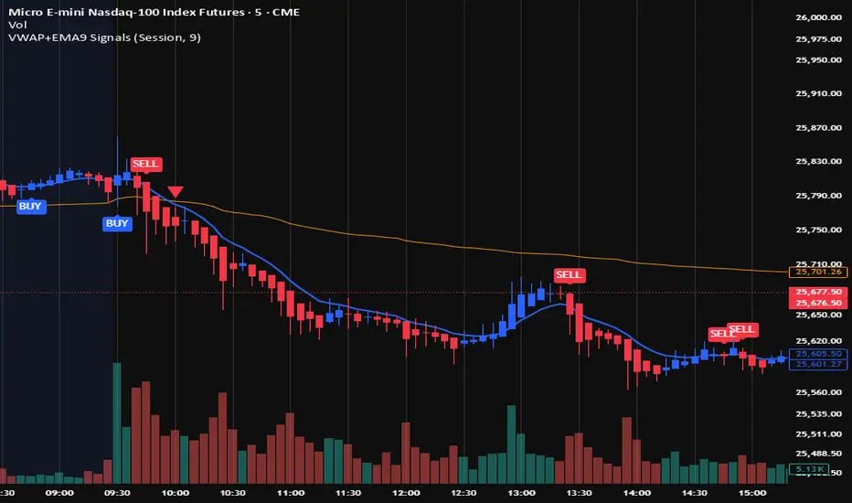 This script is for scalping on the 5 minute timeframe. It contains signals that indicate intersection of VWAP by the EMA9. It contains Buy signals when a candle closes above both lines indicating a quick continuation of a long position (quick scalp) as well as Sell signals when a candle closes below both lines indicating a quick continuation of a short position (quick scalp). Please note that i do not recommend entries at Buy and Sell signals during Accumulation/Consolidation. Positions should be taken with volume.