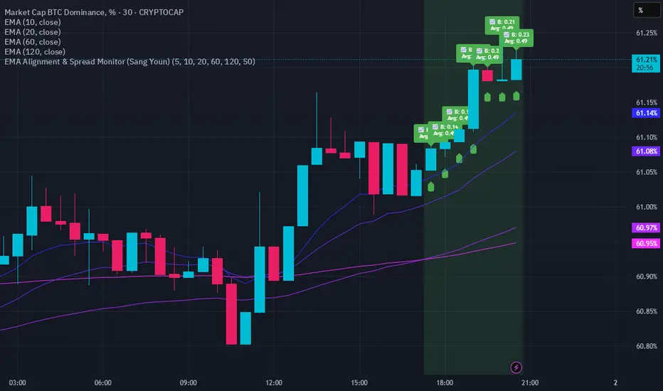 The EMA Alignment & Spread Monitor is a dynamic trading script designed to monitor EMA (Exponential Moving Average) alignments, track spread deviations, and provide real-time alerts when significant conditions are met. This script allows traders to customize their EMA periods, analyze market trends based on EMA positioning, and receive visual and audio alerts when key spread conditions occur.