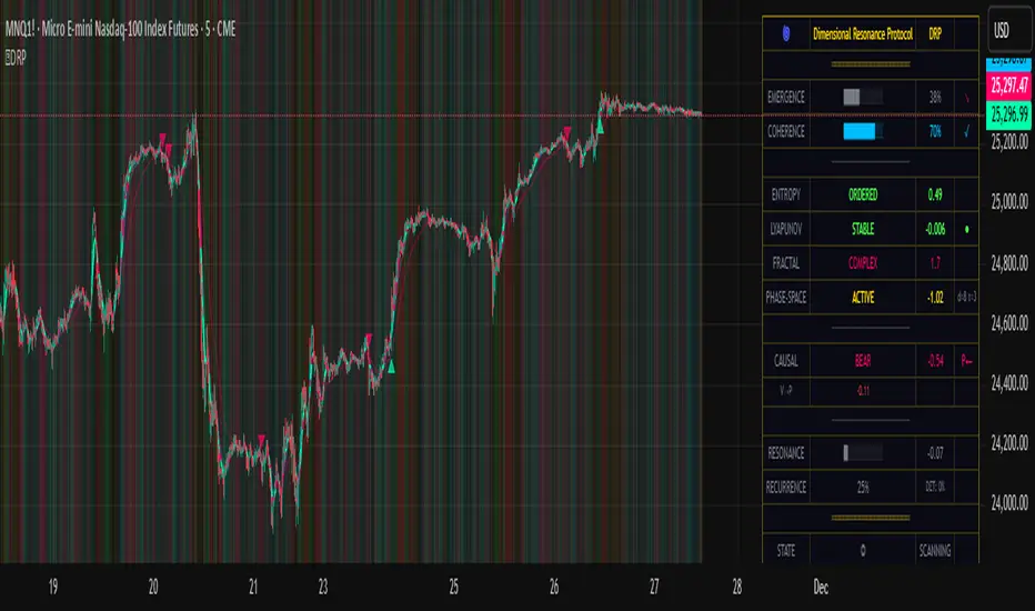 The Dimensional Resonance Protocol represents a paradigm shift from traditional technical analysis to complexity science. Rather than measuring price levels or indicator crossovers, DRP reconstructs the hidden attractor governing market dynamics using Takens' embedding theorem, then detects emergence—the rare moments when multiple dimensions of market behavior spontaneously synchronize into coherent, predictable states.