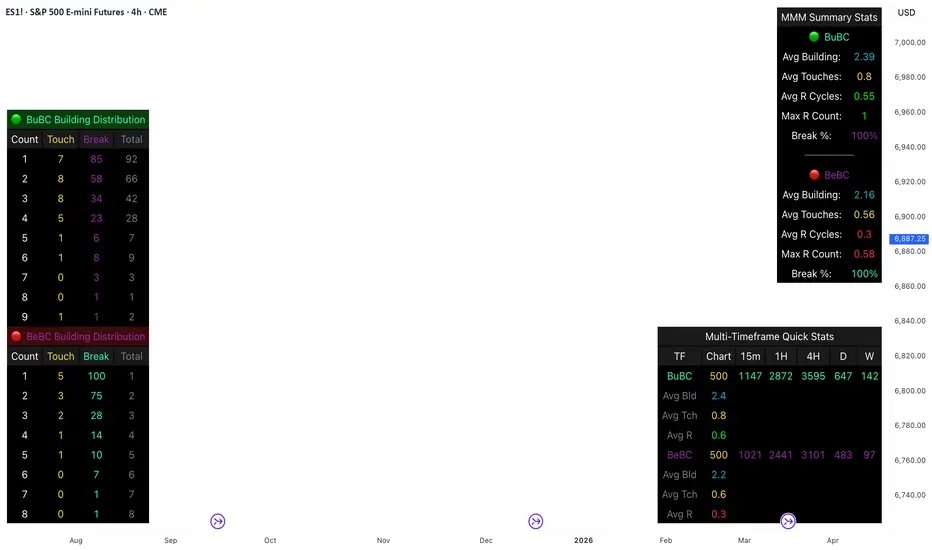 The Continuity & Failure Stats indicator tracks sequences of Bullish Body Closes (BuBC) and Bearish Body Closes (BeBC). It measures three critical phases: Building (pure momentum), Touching (price retesting the low/high of the sequence), and Resumption (price continuing the trend after a retest). It provides a statistical distribution of how long these "buildings" typically last before failing, allowing traders to know exactly when a trend is overextended.
