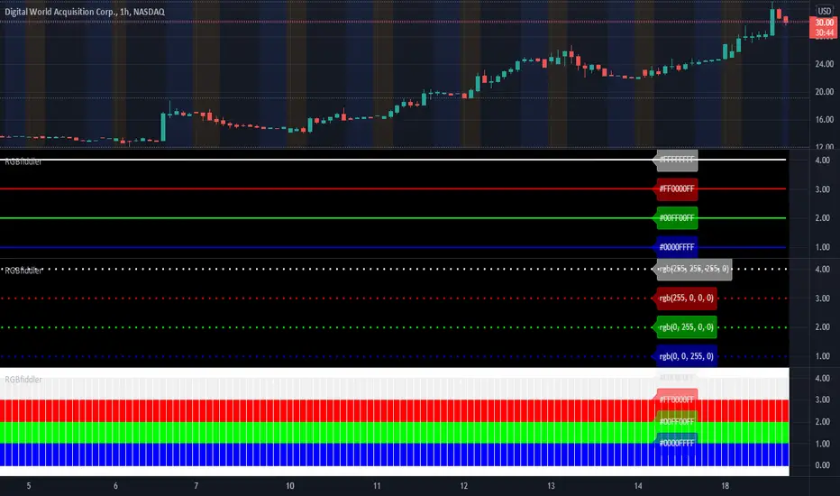 This is my "RGB Color Fiddler", intended as a toy to play with. This colorcator is rated 'E' for every TV member. With this you can quickly generate about 1.67 million potential colors from color.rgb(). While I have a few preferred colors that are ideal for use, this allows you to finely tune colors to anything that pleases your eye on your canvas.