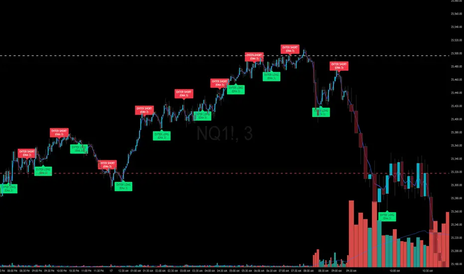 This indicator is a clean, directional EMA(6) crossover entry tool designed to identify high-quality trend entries while eliminating crossover noise. It plots a single EMA with a default length of 6 (optionally overridden by a user-defined length) and generates an ENTER LONG signal when price crosses above the EMA and an ENTER SHORT signal when price crosses below it. To prevent signal spam in trending or choppy conditions, the logic uses a directional arming system, allowing only one entry per direction until price crosses back to the opposite side of the EMA. An optional cooldown period further limits how frequently signals can occur. The result is a disciplined, visually clean entry tool that highlights meaningful momentum shifts rather than repeated micro-crosses around the moving average.
