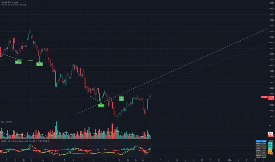 Bullish: Price makes lower lows while MACD makes higher lows (green "Bull Div" label)