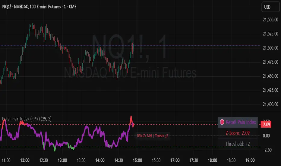 The Retail Pain Index (RPIx) is a next-generation volatility and sentiment tool designed to reveal the hidden moments when retail traders are most likely being squeezed, stopped out, or forced to capitulate. This is not just another oscillator—it’s a behavioral market scanner that quantifies “pain” as price rips away from the average entry zone, often marking the fuel for the next big move.