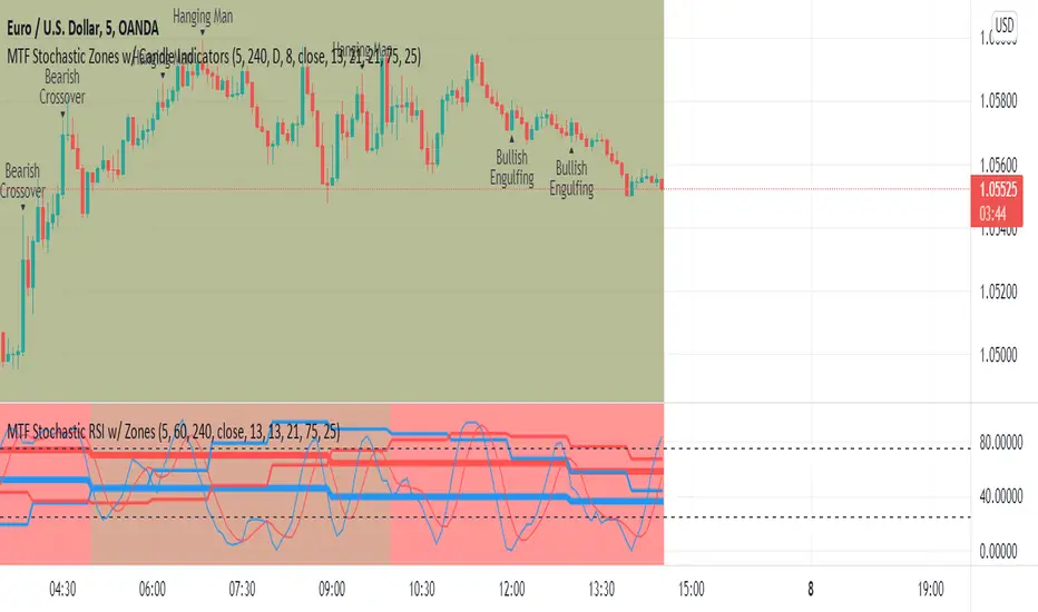Can be used in conjunction with the MTF Stochastic RSI w/ Zones which is displayed in the lower panel.