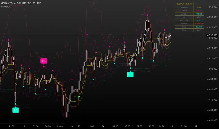 Fractal Market Geometry is an open-source overlay indicator that combines fractal analysis with harmonic pattern detection, Fibonacci retracements and extensions, Elliott Wave concepts, and Wyckoff phase identification. It provides traders with a geometric framework for understanding market structure and identifying potential reversal patterns with multi-factor signal confirmation.