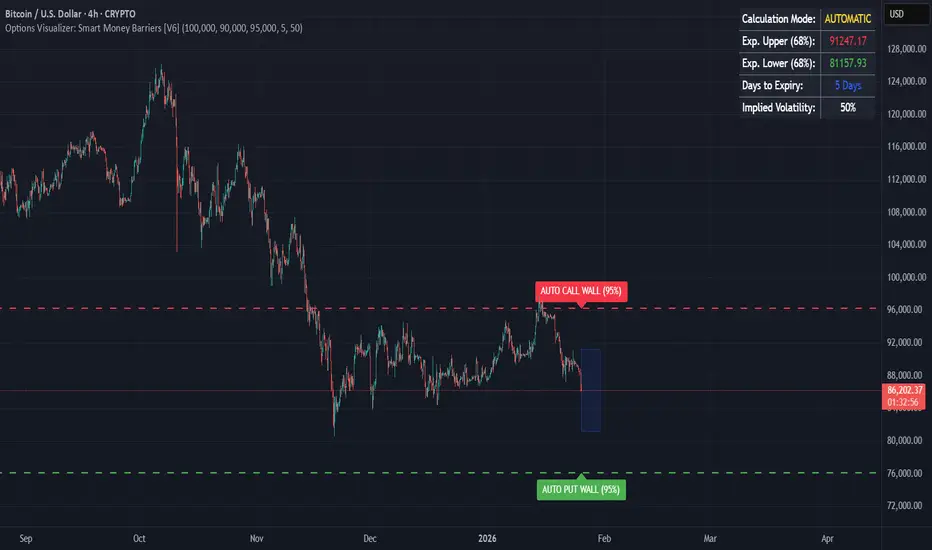 - Breakouts: A sustained candle close outside the 95% Auto Walls suggests a "Black Swan" event or a massive short/gamma squeeze.