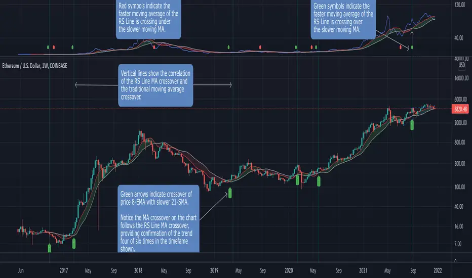 This project is a collaborative effort with blakedavis17 a Crypto-Equity Analyst. Based on a discussion with Blake about a moving average crossover using the RS Line, we created a simple indicator to explore the concept further. We were very encouraged with the results of backtesting and decided to publish the indicator as we believe it may be a helpful tool for both equity and crypto traders.