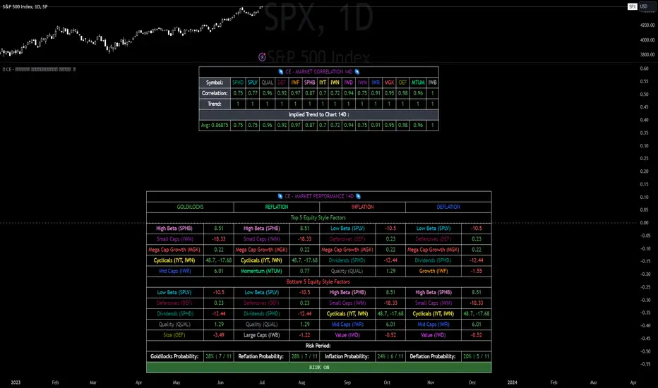 Furthermore the 𝓜𝓪𝓻𝓴𝓮𝓽 𝓟𝓮𝓻𝓯𝓸𝓻𝓶𝓪𝓷𝓬𝓮 𝓣𝓪𝓫𝓵𝓮 provides the Correlation Implied Trend for the Asset on the Chart. Lastly it provides information about current "RISK ON" or "RISK OFF" periods.
