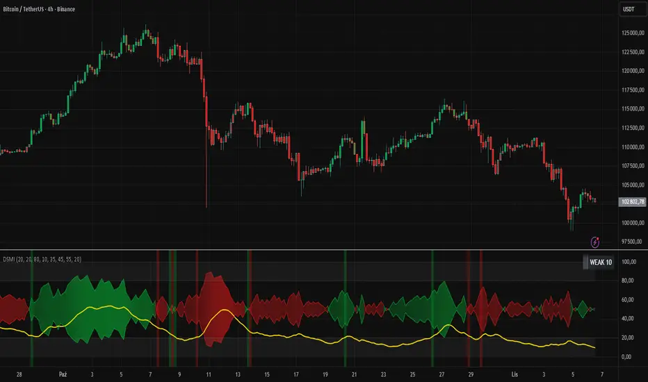 “Directional Strength and Momentum Index” (DSMI) is a technical analysis indicator inspired by DMI, but due to different source data, it produces distinct results. DSMI combines direction measurement, trend strength, and overheat levels into a single index, enhanced with gradient fills, extreme zones, entry signals, candle coloring, and a summary table.