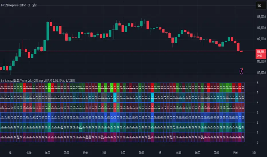 The Bar Statistics indicator is a comprehensive analytical tool designed to provide traders with detailed insights into market microstructure through advanced volume analysis, open interest tracking, and market flow detection. This indicator transforms complex market data into easily digestible visual information, displaying six key metrics in customizable colored boxes that update in real-time.