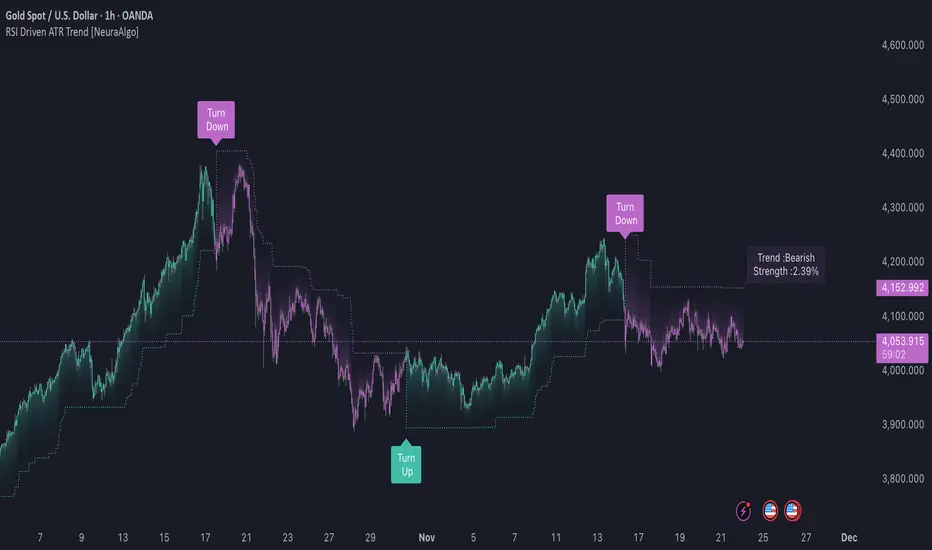 - Dynamically calculates trend levels based on RSI and ATR interactions.