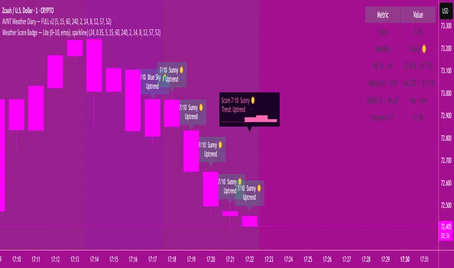 Tiny last-bar badge that turns multi-TF momentum into a 0–10 “weather” score with emoji, a trend word, and a mini sparkline.