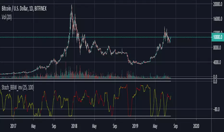 This script calculate a stochastic oscillator of BBW, and defines a top and a bottom as its highest in N bars.