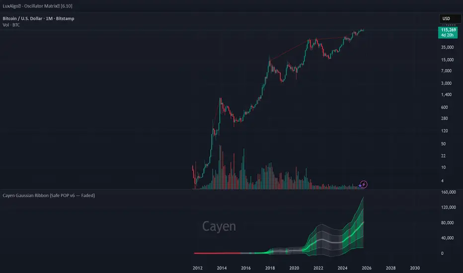 A clean Gaussian filter ribbon that maps trend + volatility without the jitter. Uses a Gaussian smoother, a tiny EMA basis, and two standard-deviation bands. Colors fade with distance from the basis, and flips are softened (no knife-edge).