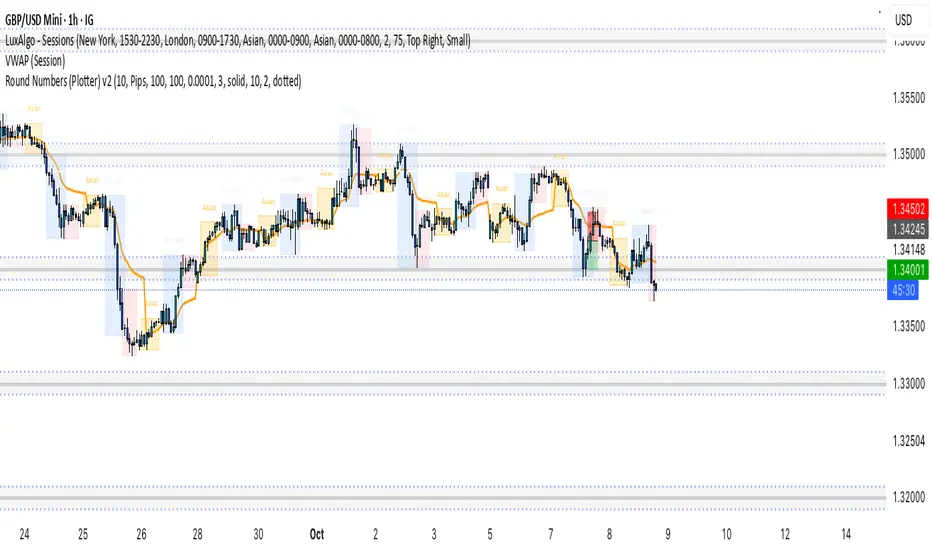 The *Round Numbers (Plotter) v2* indicator highlights key psychological price levels on the chart — the so-called *round numbers* (e.g. 1.1000 on EURUSD or23,000 on NASDAQ).