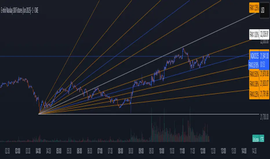 Once two pivots are identified, the script draws multiple fan lines from the first pivot outward, at angles defined by a preset list of Fibonacci levels. These fan lines help visualize speed and strength of a price move.