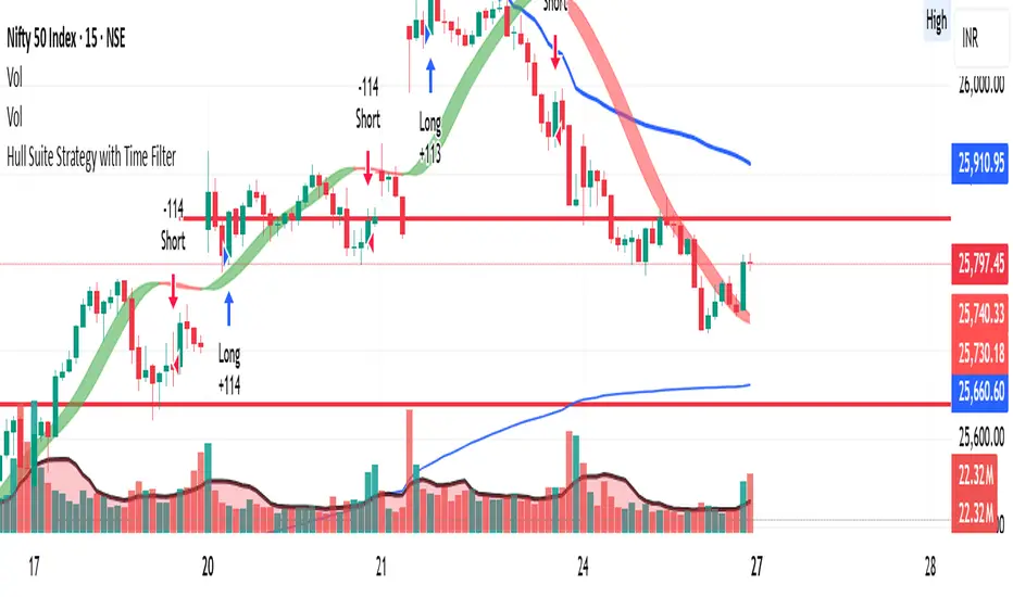 This script is a Hull Moving Average–based trend system designed to visualize market direction and filter signals during specific trading hours.
