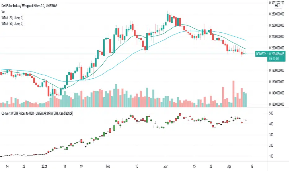 Uniswap instrument prices are in WETH. This indicator translates the series to USD prices and plots the series as candles or as a line. Data is translated by using corresponding series data for ETHUSD. The reference ETHUSD price is from Coinbase.