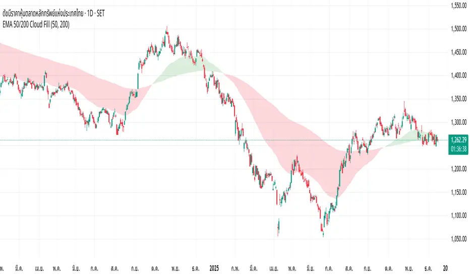 Bearish Trend: When the Fast EMA is below the Slow EMA, the background/cloud is highlighted (typically Red) to indicate a downtrend.