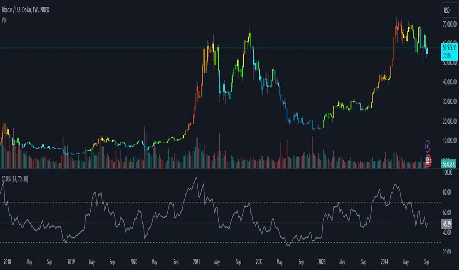 RSI-Based Color Coding: Price bars change color based on RSI values. High RSI values (above 70) show warm colors (red/orange), signaling potential overbought conditions, while low RSI values (below 30) display cool colors (blue), indicating possible oversold levels.