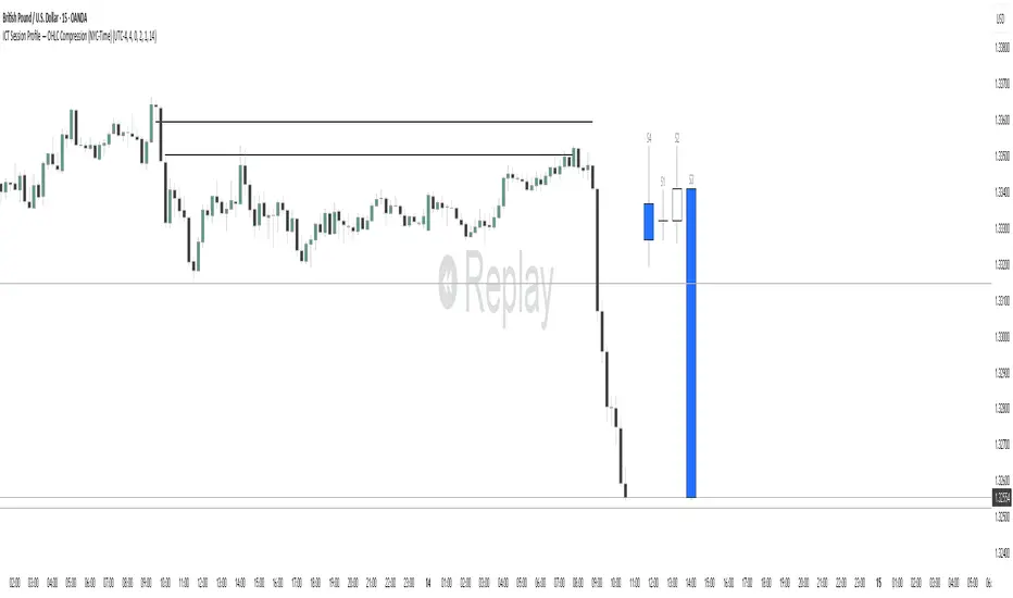ICT Session Profile — OHLC Compression (NYC-Time)This indicator compresses each New York-based session into a single OHLC candle — so no matter where you are in the world, everyone sees the exact same session structure.
