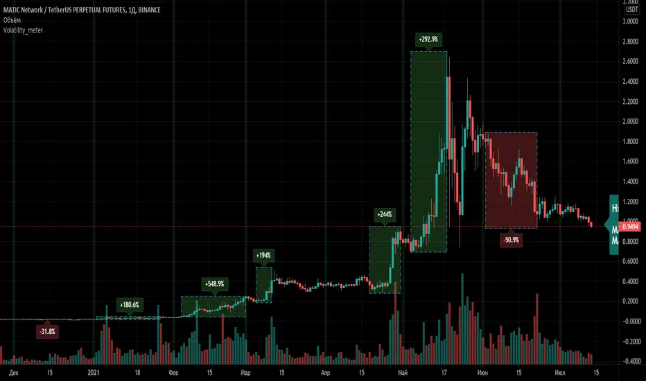 In the settings, you can select a resolution of 1 month or 1 week in size, the indicator will mark the interval you selected on the chart and calculate the maximum price change for this period.