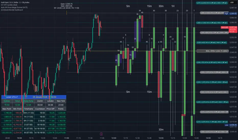 This indicator is a sophisticated visual suite designed for XAUUSD (Gold) traders. It integrates Market Session Timing and Multi-Timeframe Performance into a single, non-intrusive dashboard. The goal is to provide a "Single Source of Truth" for price acti