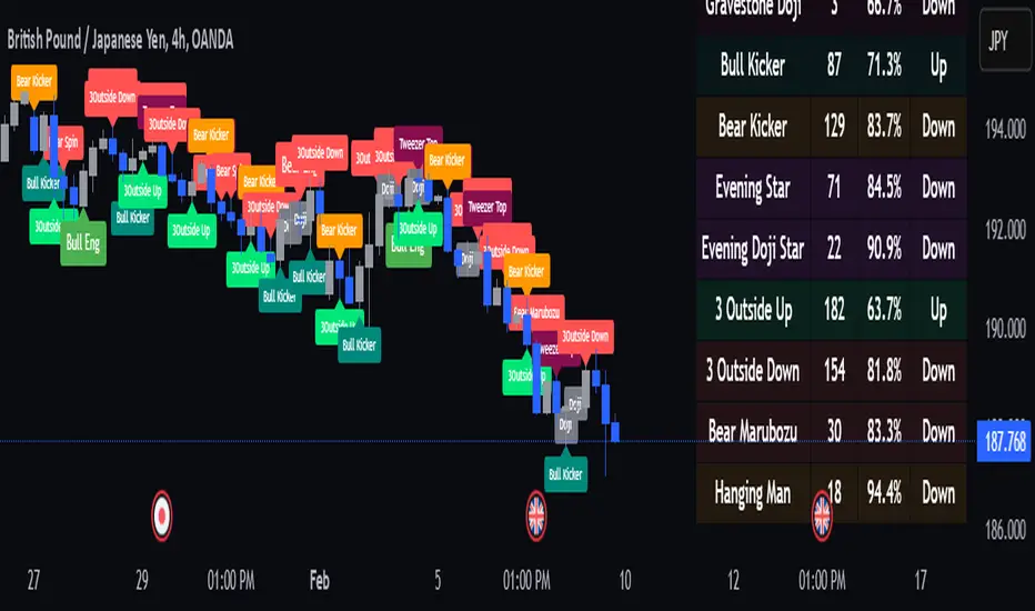 The script operates by scanning historical bars, collecting statistical outcomes from each detected pattern, and then computing the probability of reversal or continuation. It provides a dynamic probability table on the chart that displays the count and percentage probability of each pattern, along with the direction of the signal (Up or Down). This parallel backtesting methodology saves time and enables traders to compare the strength of different candlestick formations at a glance.