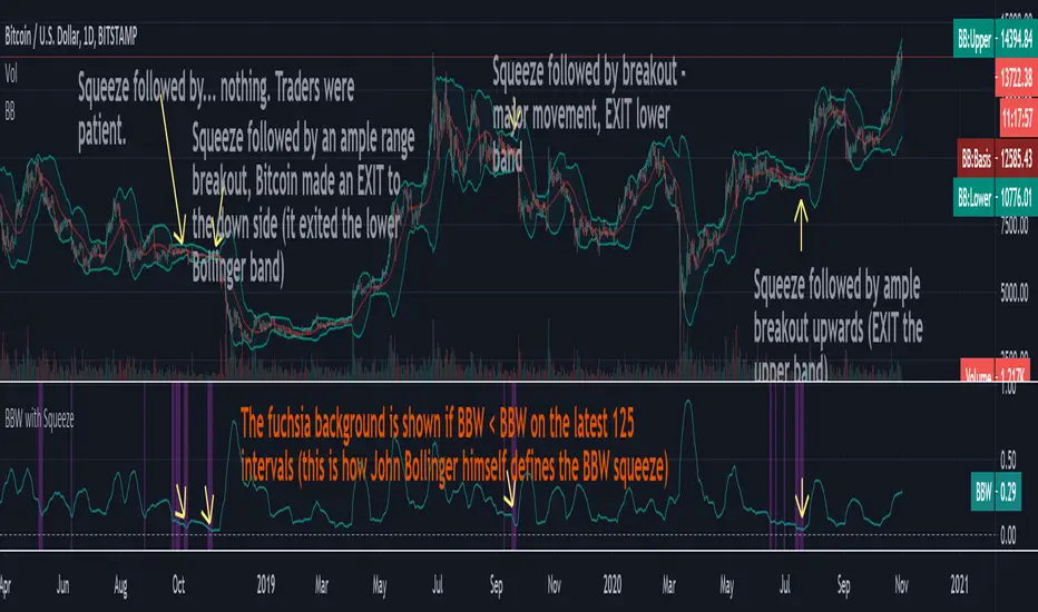 This is the standard Bollinger Bands Width (BBW) indicator with the added capability of detecting the "Bollinger Bands Squeeze" as defined by John Bollinger: