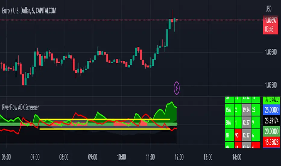 RiverFlow ADX Screener, Scans ADX and Donchian Trend values across various Timeframes. This screener provides support to the Riverflow indicator. Riverflow concept is based on Two indicators. Donchian Channel and ADX or DMI.