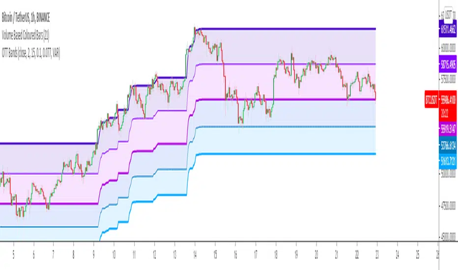 OTT Bands tries to determine accurate support and resistance levels after users manually set the 2 optimization coefficients (for UPPER AND LOWER BANDS) just by having the highest and lowest price levels inside the OTT Bands.