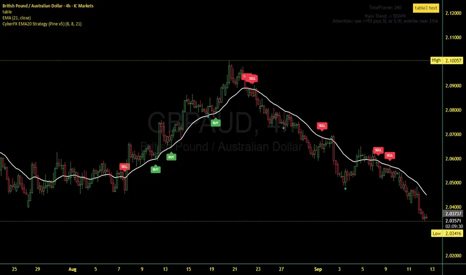 This is a simple indicator that can be used for a simple strategy. It follows the logic of the price always move back to the media, in that case an EMA(21). This give us an opportunity to achieve a better R/R. One important thing here is this indicator works better on trend markets. When the market is in consolidation mode it will show many signals so we need to pay attention and be patient. This indicator works better in 4H timeframes but it can used with other TFs.