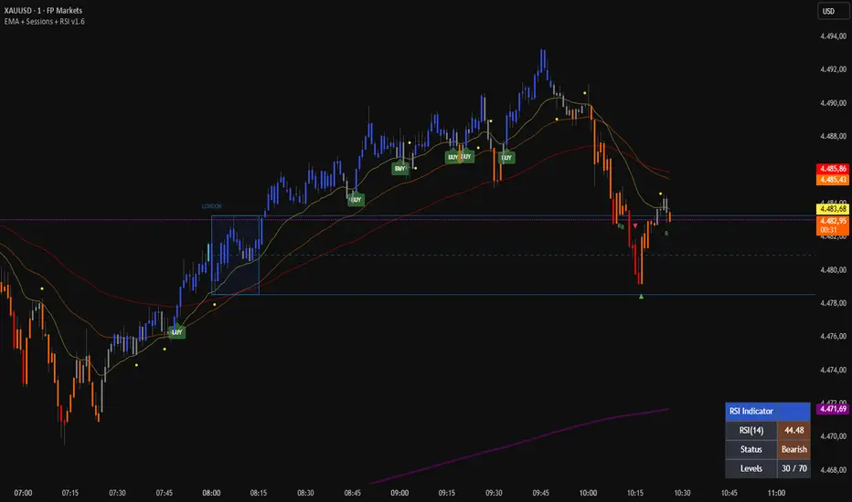 This is a simple on-demand indicator. It includes 3 customizable exponential moving averages, three customizable market sessions, and a table showing the status of the RSI