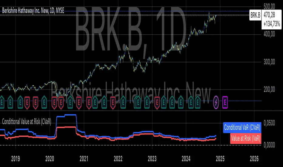 This Pine Script implements the Conditional Value at Risk (CVaR), a risk metric that evaluates the potential losses in a financial portfolio beyond a certain confidence level, incorporating both the Value at Risk (VaR) and the expected loss given that the VaR threshold has been breached.