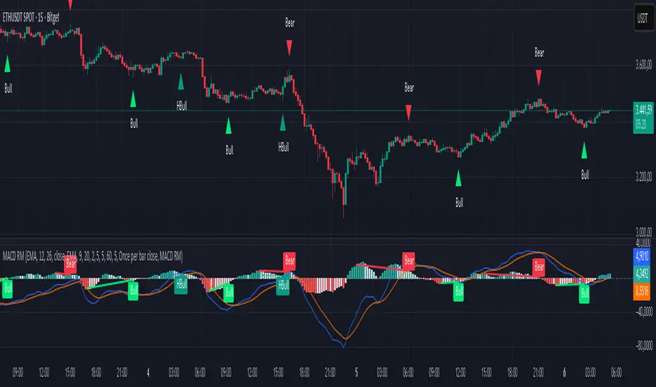 Alerts: Enable / Regular / Hidden / Frequency / Prefix — Control alert emission, categories, cadence, and label. Defaults: Enabled, both categories on, once per bar close, prefix “MACD RM”.