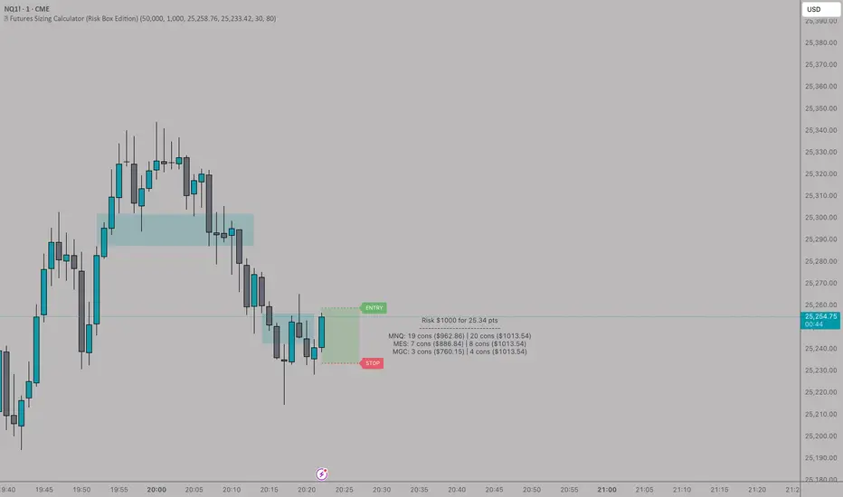 Clean simple, risk indicator that will allow you to see risk before entering trade. This will allow you to use it on MES, MGC and MNQ.