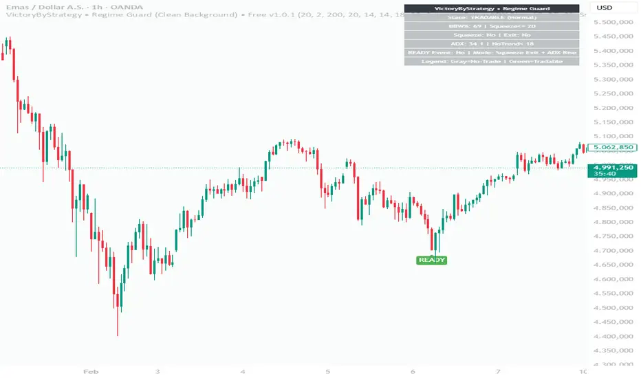 Instead of generating buy or sell signals, Regime Guard focuses on identifying whether the market is in a No-Trade (compression/choppy) condition or a Tradable (normal expansion) state.
