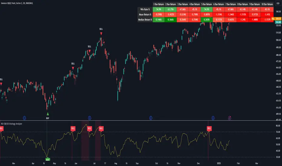The RSI OB/OS Strategy Analyzer is a comprehensive trading tool designed to help traders identify and evaluate overbought/oversold reversal opportunities using the Relative Strength Index (RSI). It provides visual signals, performance metrics, and a detailed table to analyze the effectiveness of RSI-based strategies over a user-defined lookback period.