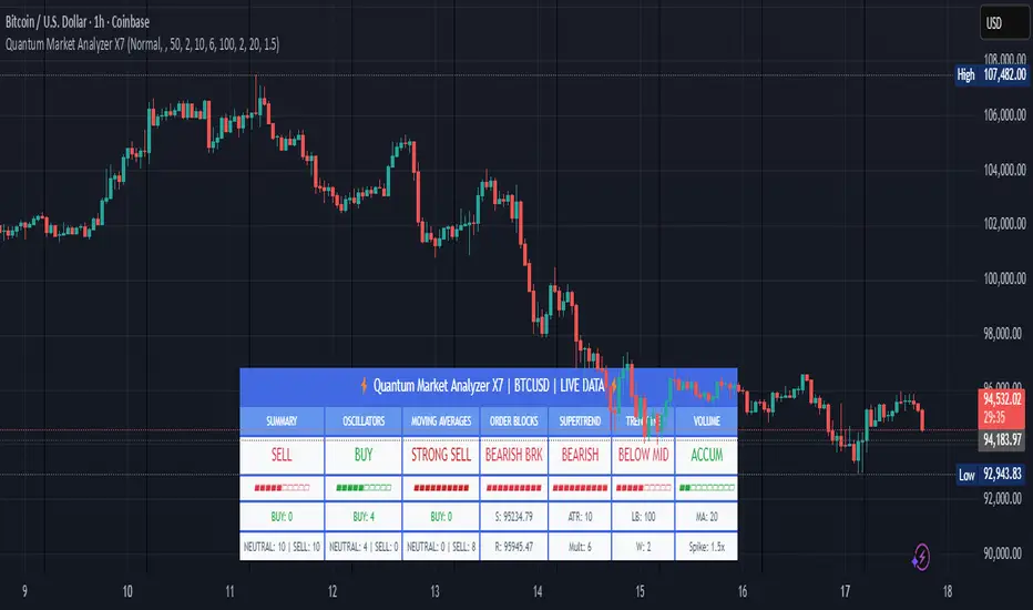 The Quantum Market Analyzer X7 is a comprehensive multi-timeframe technical analysis indicator that combines traditional and modern analytical methods. It aggregates signals from multiple technical indicators across seven key analysis categories to provide traders with a consolidated view of market sentiment and potential trading opportunities.