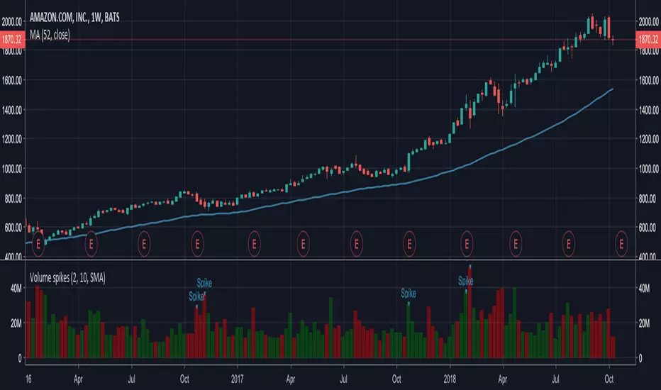 By default spike is defined as such when volume is 2 times higher than average volume for last 10 volume bars (this can be changed in settings)